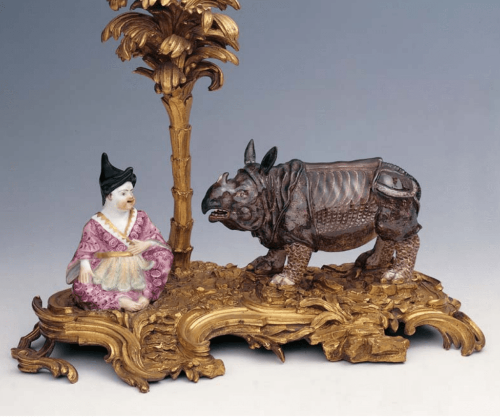Songs and poems were written about Clara as well as wonderful decorations like this Rhinoceros Mounted with a Chinoiserie Figure. Porcelain and bronze ca.1740. Frankfurt, (Museum für Angewandte Kunst.)