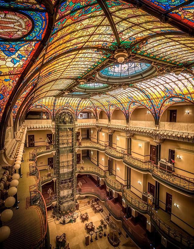 This Art Nouveau masterpiece was made in1899 as the Mercantile Center, inspired by French department stores like the Bon Marche and Galleries Lafayettes and built with the latest techniques from Europe and the US. The stained-glass ceilings were made by Frenchman Jacques Grüber.