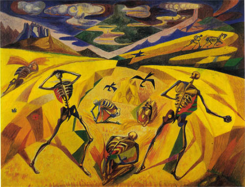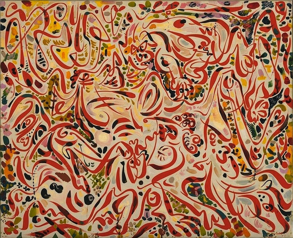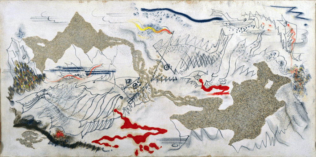 “During the mid-1920s Masson explored automatic drawing with paint, a material that traditionally requires a deliberate approach and frequently reloading paint on a brush. To allow a more spontaneous paint flow, Masson began squeezing paint directly from the tube (an innovation that would later inspire a younger generation of artists, including American Abstract Expressionist Jackson Pollock). Masson’s Battle of Fishes is a prime example of what became known as his “sand paintings” by pouring gesso onto a canvas, smearing it around, improvising with his fingers, and throwing sand onto the sticky surfaces to create a textured, earthy ground. He then poured on the red paint and added his charcoal and pencil, combining painting and drawing. Pouring glue and paint, and throwing sand, ensured that gravity and chance also played significant roles in the creation of the work of art.” STEPHANIE CHADWICK at Smart History.org