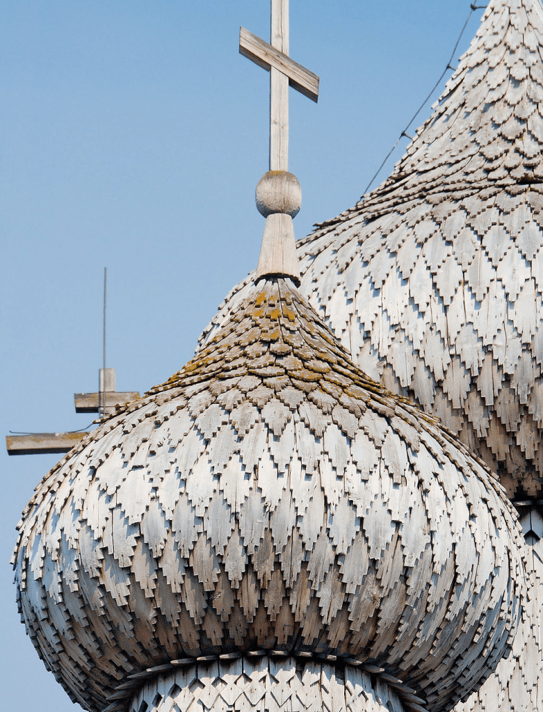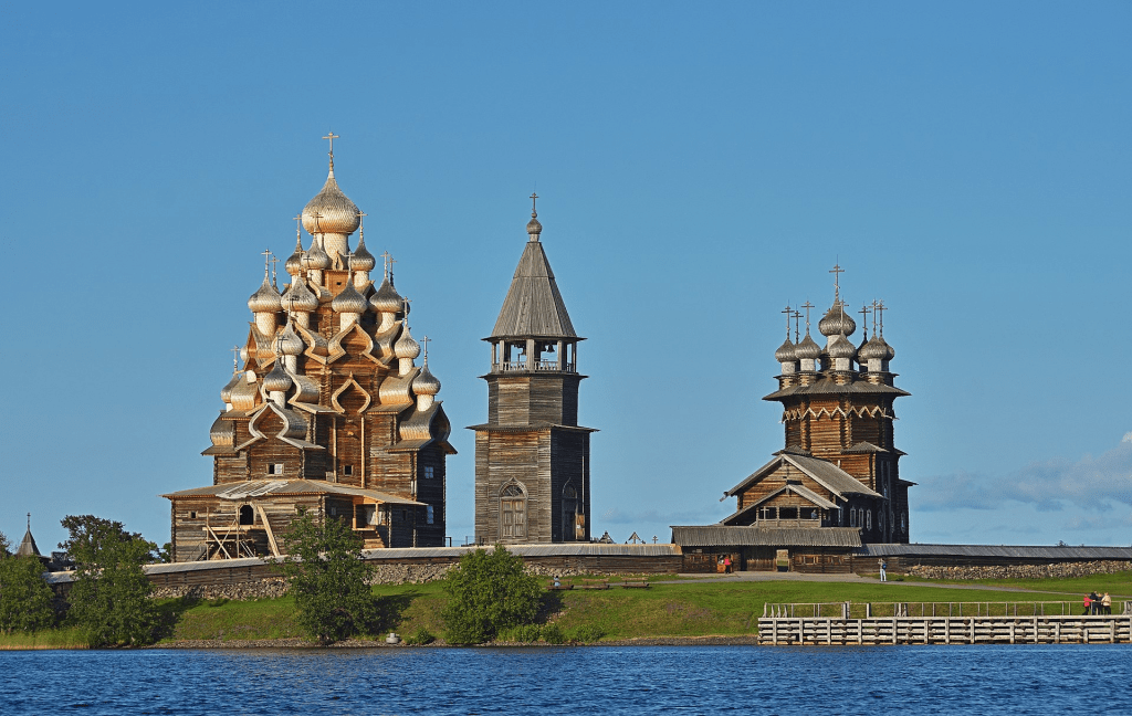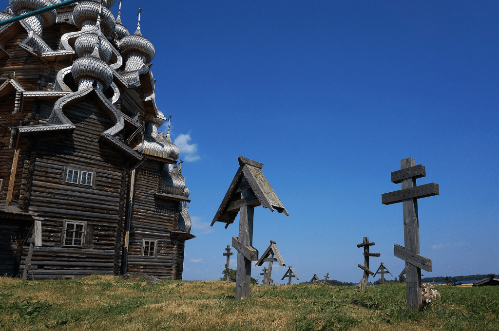 Kizhi Pogost (Russian: Кижский погост), 17th century, Russian Orthodox, a pogost is the combination of a church and a cemetery, usually in a rural setting. Kizhi Pogost is made out of the wood of Baltic Pines (Pinus sylvestris) and has two churches, a graveyard and a bell tower.