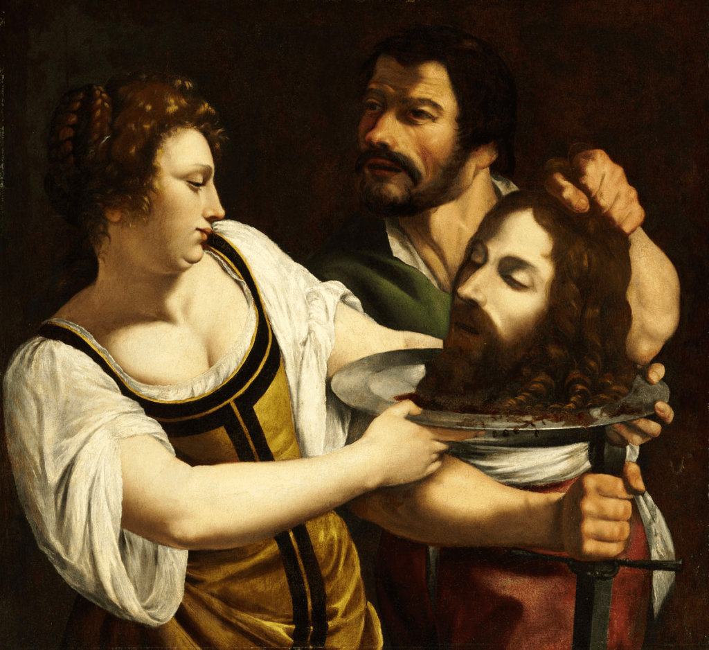 The degree to which Gentileschi‘s many depictions of scandalous and murderous women are self-portraits is ambiguous and much debated. Is she the model for Salome and Judith, Mary-Magdelene or Cleopatra?