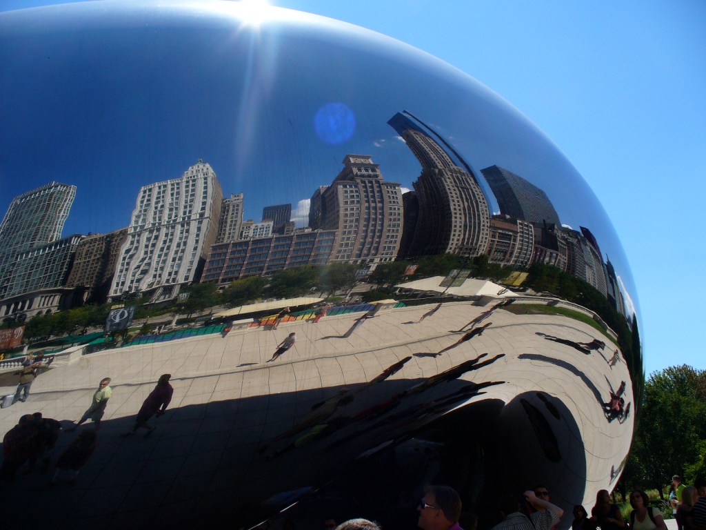 Seen from the front, half of the sculpture reflects the sky, the viewer mentally walks into the horizon, entering the Cloud Gate. The top is convex (bulging out), it lengthens and bends the famous buildings around the park (see below). You can walk under Cloud Gate. The underside is convex, shortening and distorting reflections (see above).