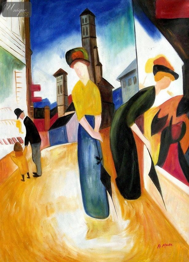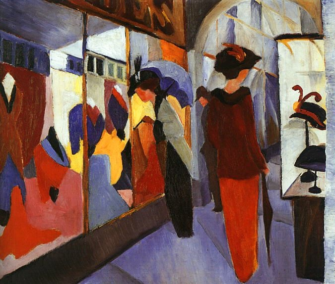 August Mack was born in 1887, in Meschede, Westphalia, Germany. He died in1914 at the front in WWI. He started as a member of Der Blaue Reiter (The Blue Rider) school of painting with Kandinsky and Marz. When he lived in Hilterfingen, Lake Thun, Switzerland, he painted the window shoppers of the town, with a noted predilection for fashionable hatted ladies shopping for hats.