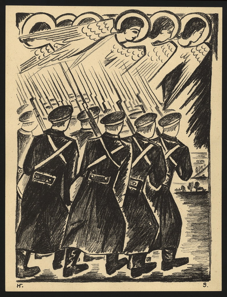 Her series Mystical Images of War, mixing Russian religious iconography, Avant-Garde painting and militaristic propaganda is a mesure of how the Art world has changed its depictions of War after WWI. Along with the Italians Futurists and many others at the time, Goncharova found beauty and spiritual exaltation in warfare.