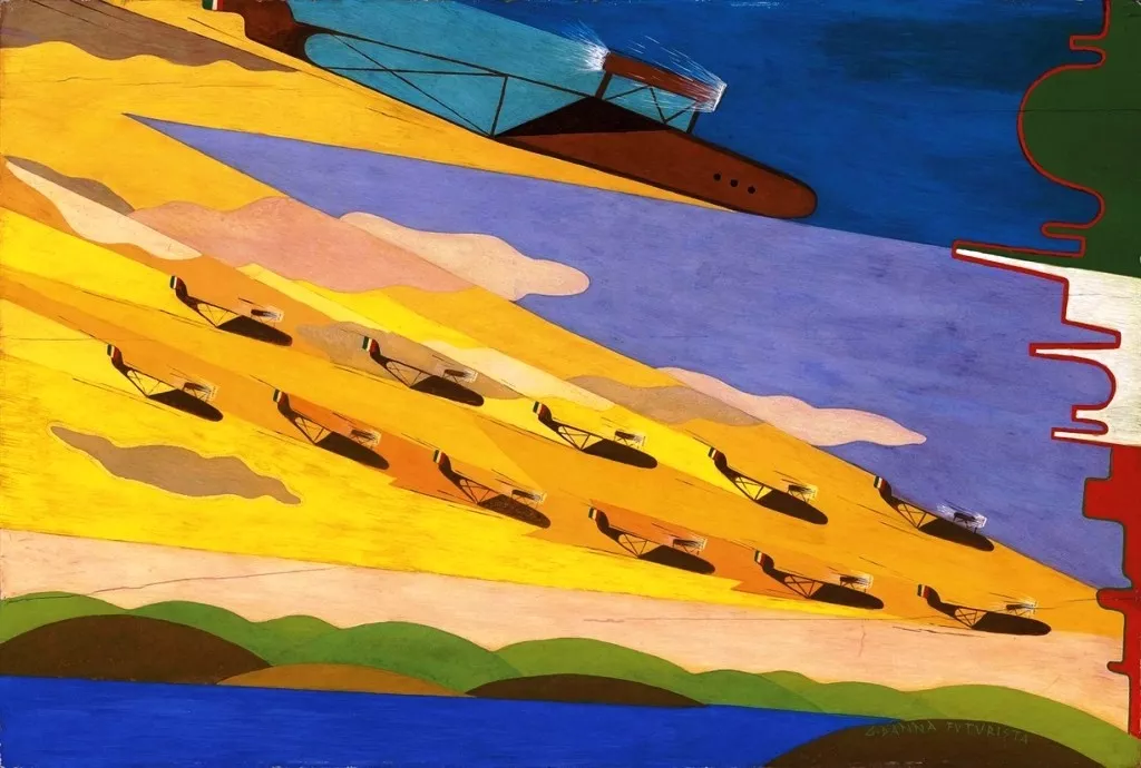 Aeropainting (Aeropittura) is a sub-genre of Futurismo, or Futurism, an Italian art mouvement of the early XXth century that embraced the modern age and its technologies as beautiful.