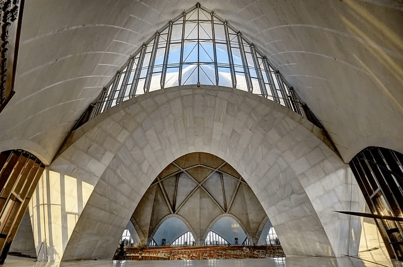 “The third set of nine petals, called the ‘inner leaves’, appear to be partly closed. Only the tips open out, somewhat like a partly opened bud. This portion, which rises above the rest, forms the main structure housing the prayer hall. Near the top where the leaves separate out, nine radial beams provide the necessary lateral support. Since the lotus is open at the top, a glass and steel roof at the level of the radial beams provides protection from rain and facilitates the entry of natural light into the prayer hall.” According to https://bahaihouseofworship.in/