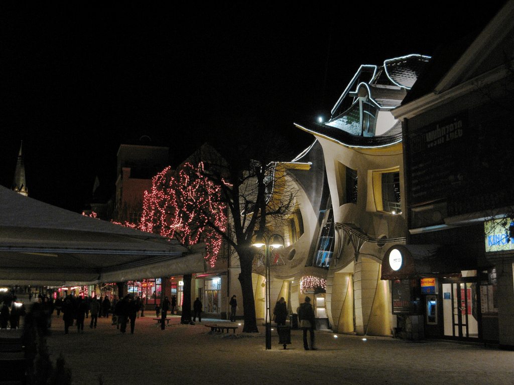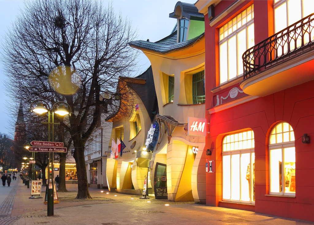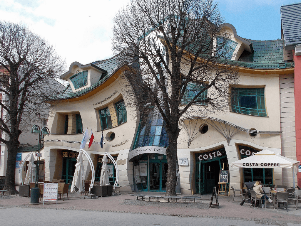 Krzywy Domek (Polish for “crooked house”) is an oddly shaped Post-Modern building in Sopot, Poland.