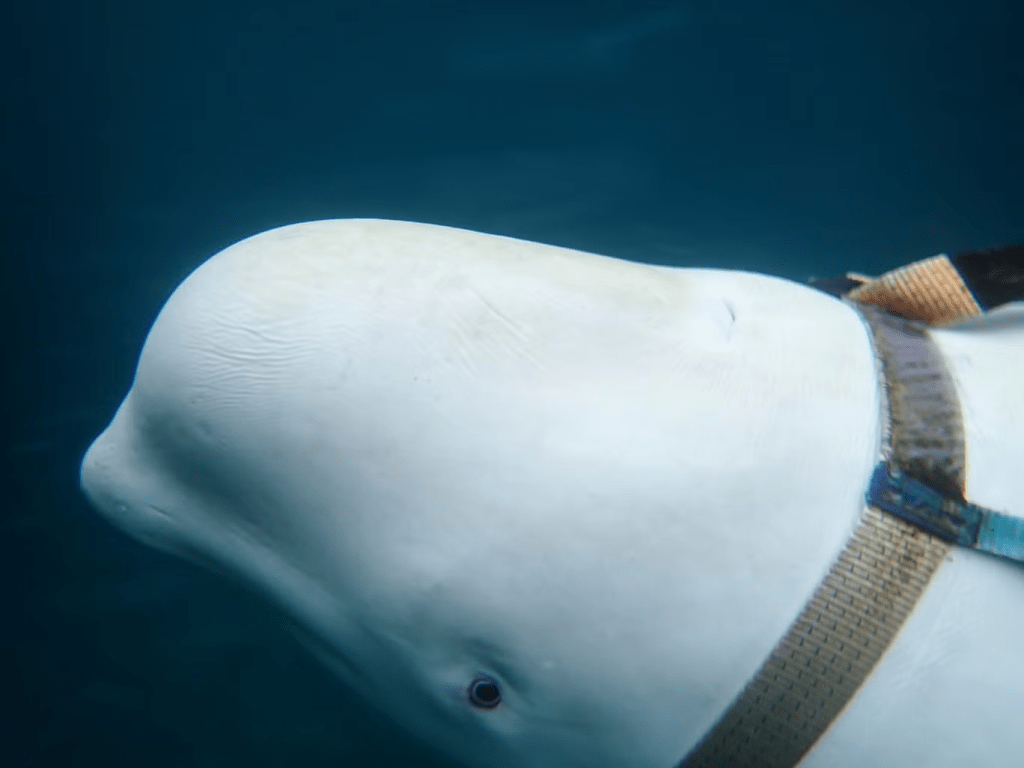 Further meetings with the Beluga were necessary before a harness was spotted on the animal and removed. The harness had a brand, Equipment of Saint Petersburg (in Russian). It had mounts for tools or cameras or who knows what else. It looked a lot like a GoPro harness.