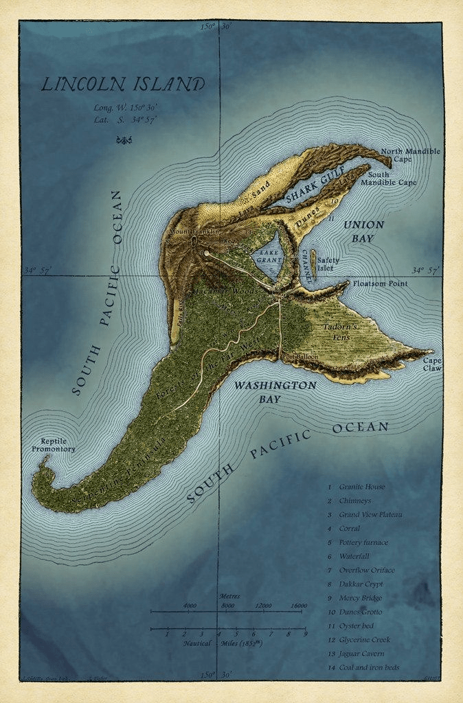 Where is the Mysterious Island? Verne is not entirely consistant throughout the novel, even switching Meridians at one point. He also uses Tabor Island as a neighbor of Mysterious Island but gets the location wrong somehow. Tabor is also known as Maria Theresa Reef or Ernest Legouve Reef. Believed to exist for centuries, the New-Zealand Navy finally proved Tabor‘s inexistence in the 1970s. Or, perhaps, things really happened like they did in the book, as coordinates in the novel sit on top of an ocean ridge where an island could have existed once.